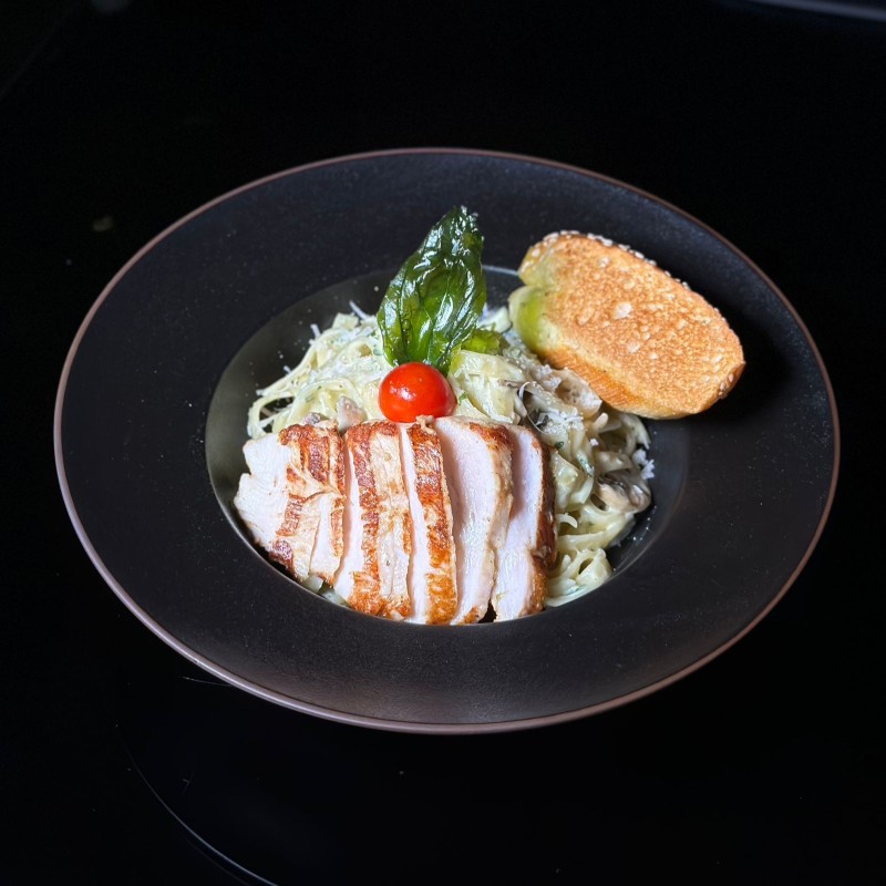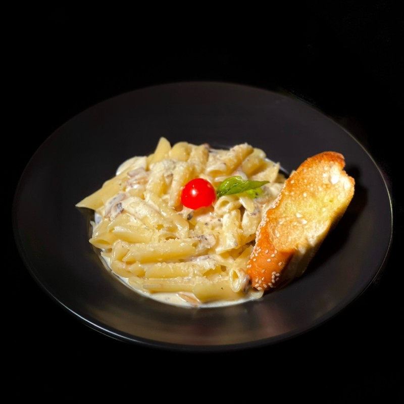 (704 سعرة حرارية)مكرونة مطهوة بصوص كريمي غني، يضاف إليها جبن بارميزان مبشور ولمسة من الأعشاب الإيطالية
