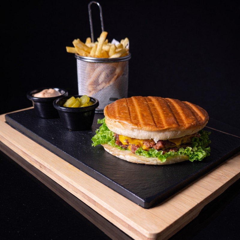قطعتان من لحم بقر مفروم ومضغوط على الطريقة الأمريكية (سماش)، مشويتين -جبنة -مخلل- وصوص خاص