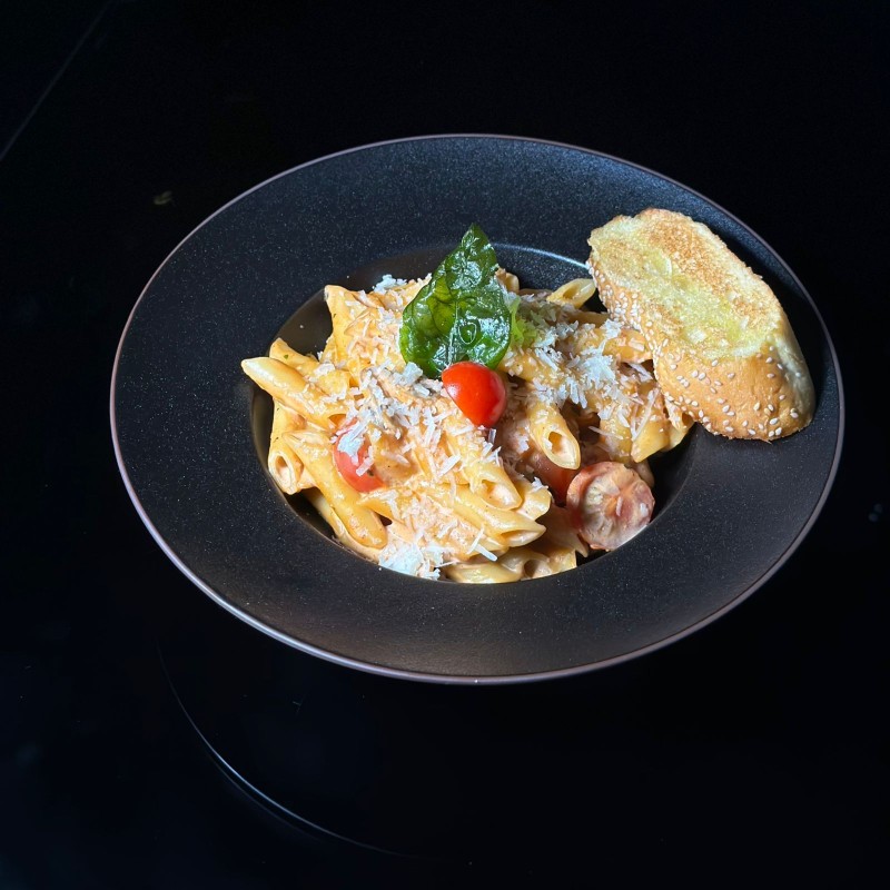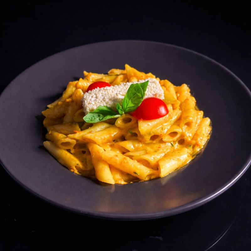 مكرونة مع صوص روزيه الكريمي (مزيج من الطماطم والكريمة)، غنية بالنكهات ومزينة بالريحان الطازج والبارميزان المبشور