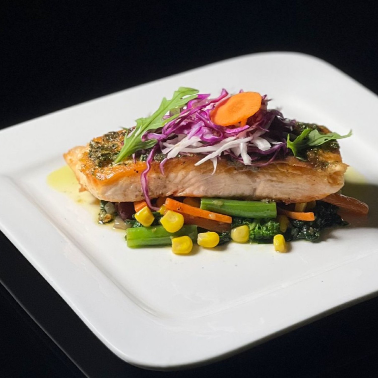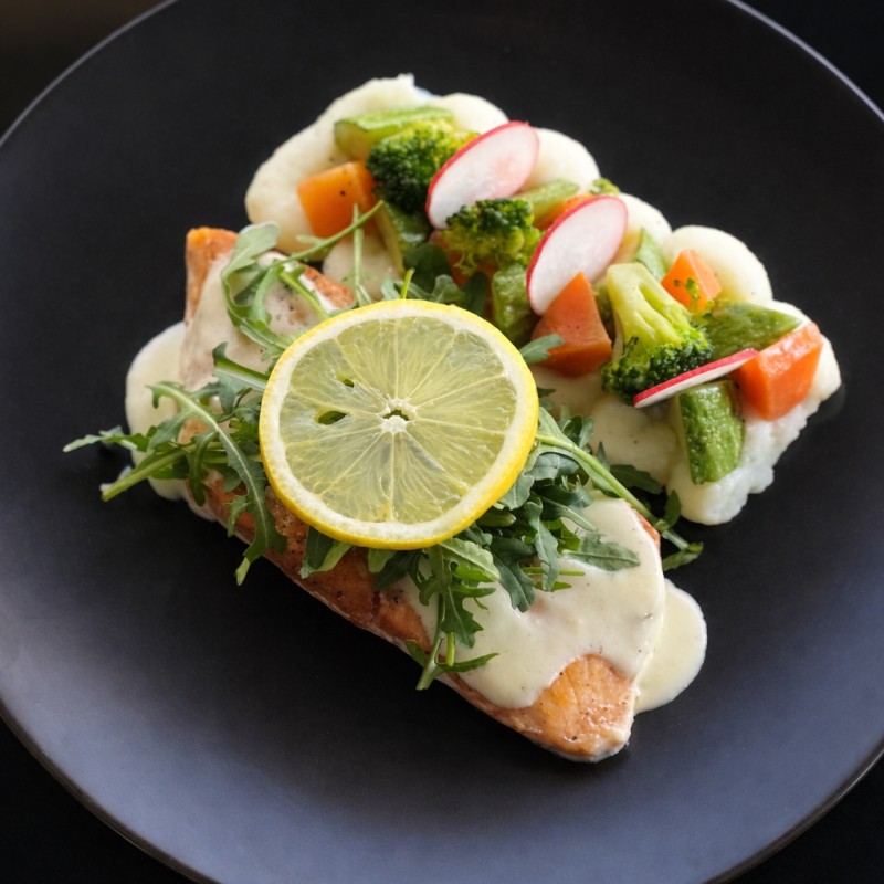 (253 سعرة حرارية)سالمون متبل بأعشاب الليمون وزيت الزيتون، يُشوى بعناية ليحافظ على طراوته ونكهته الغنية، ويُقدّم مع خضار سوتيه وصوص خاص.