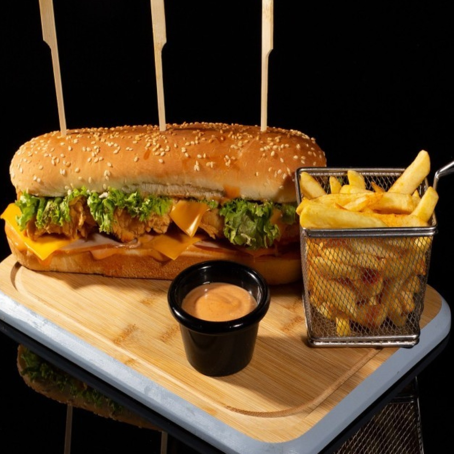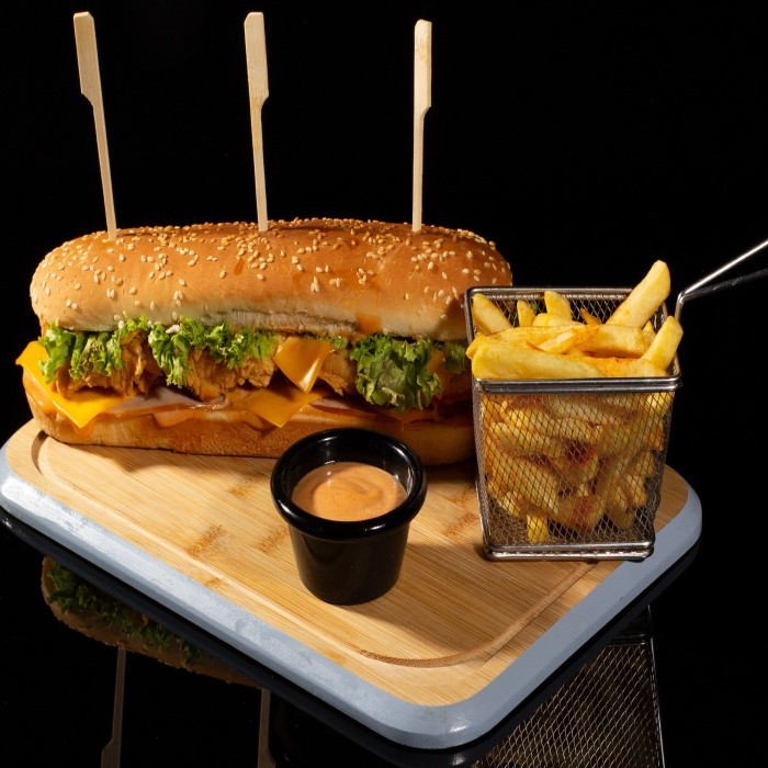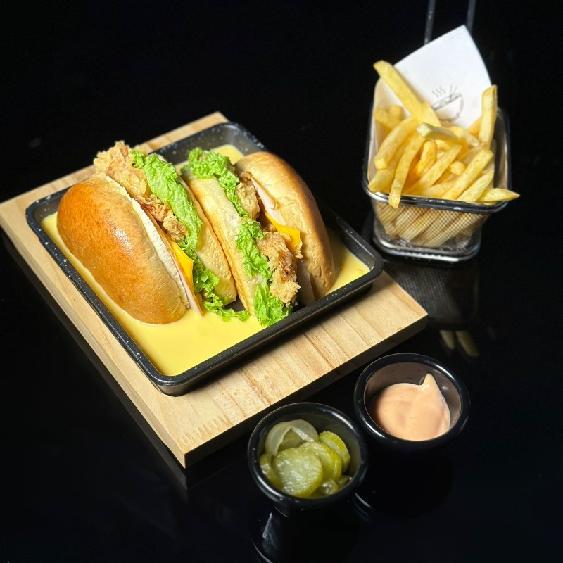 صدر دجاج مقرمش مُتبل على الطريقة الريفية، يُقدَّم داخل خبز طري مع شرائح خس طازجة، جبن ذائب، وصوص مميز يضفي نكهة لا تُقاوم.