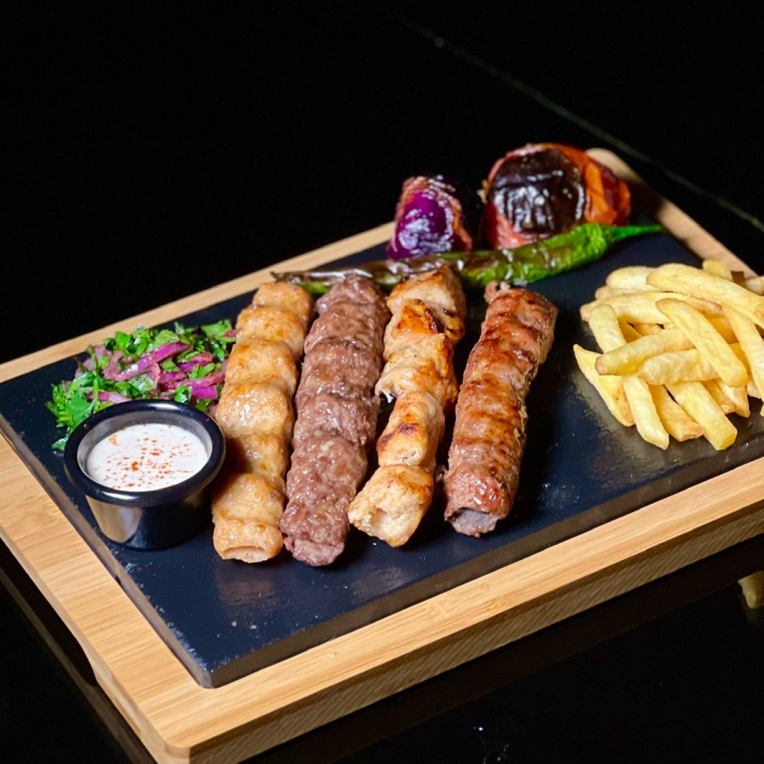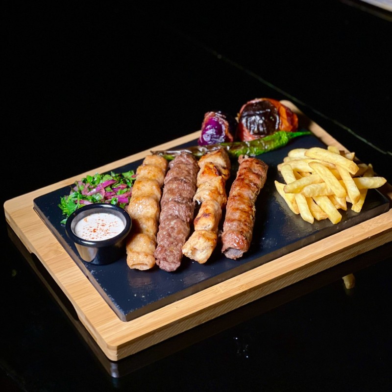 (299 سعرة حرارية)تشكيلة مشاوي مختارة بعناية تضم شيش طاووق، كباب لحم، كباب دجاج-متبلة بتوابل حماطه الخاصة ومشوية على الفحم-بطاطس مع الارز