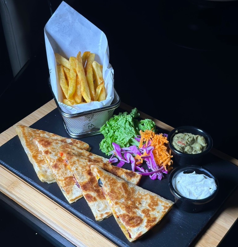 خبز التورتيلا المكسيكي محشي دجاج وخضار مع صوص الكوكتيل والبطاطس المقلية