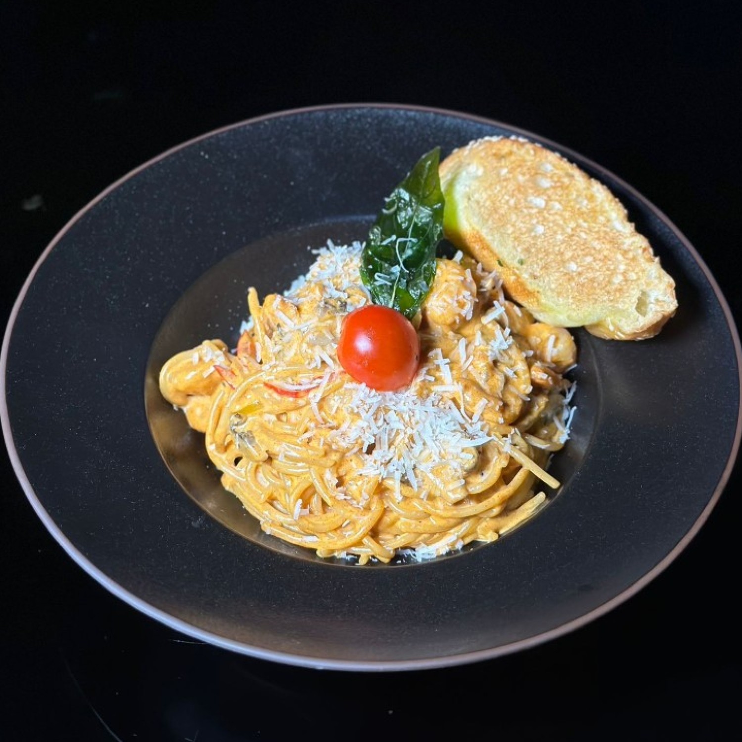مكرونة مطبوخة بصلصة كريمية غنية ممزوجة بزيت الترافل ، ورشة بارميزان