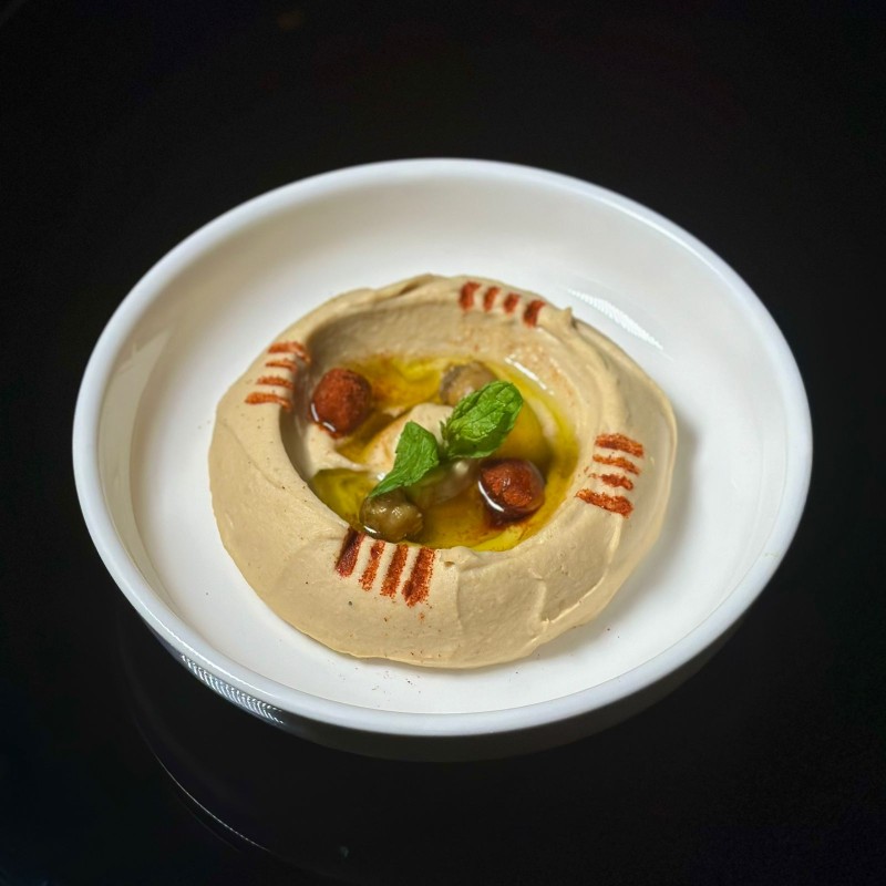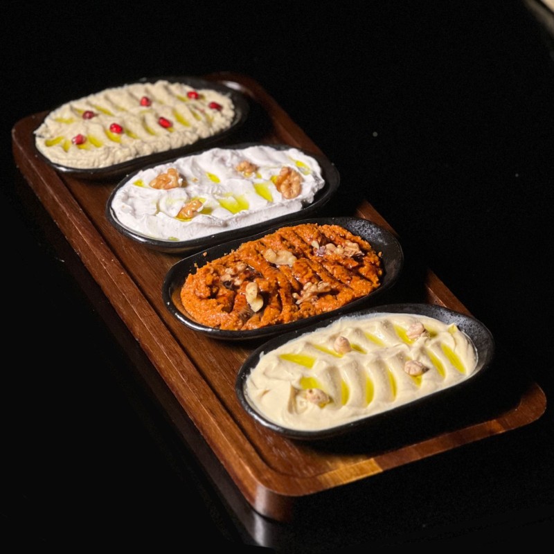 تشكيلة متنوعة من أشهى المقبلات الشرقية الكلاسيكية مثل الحمص، المتبل،تُقدَّم مع خبز عربي