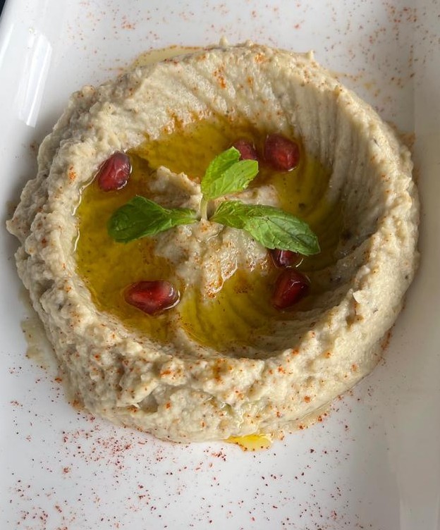 باذنجان مشوي على النار يُهرس ويُخلط مع الطحينة، الثوم، عصير الليمون، وزيت الزيتون