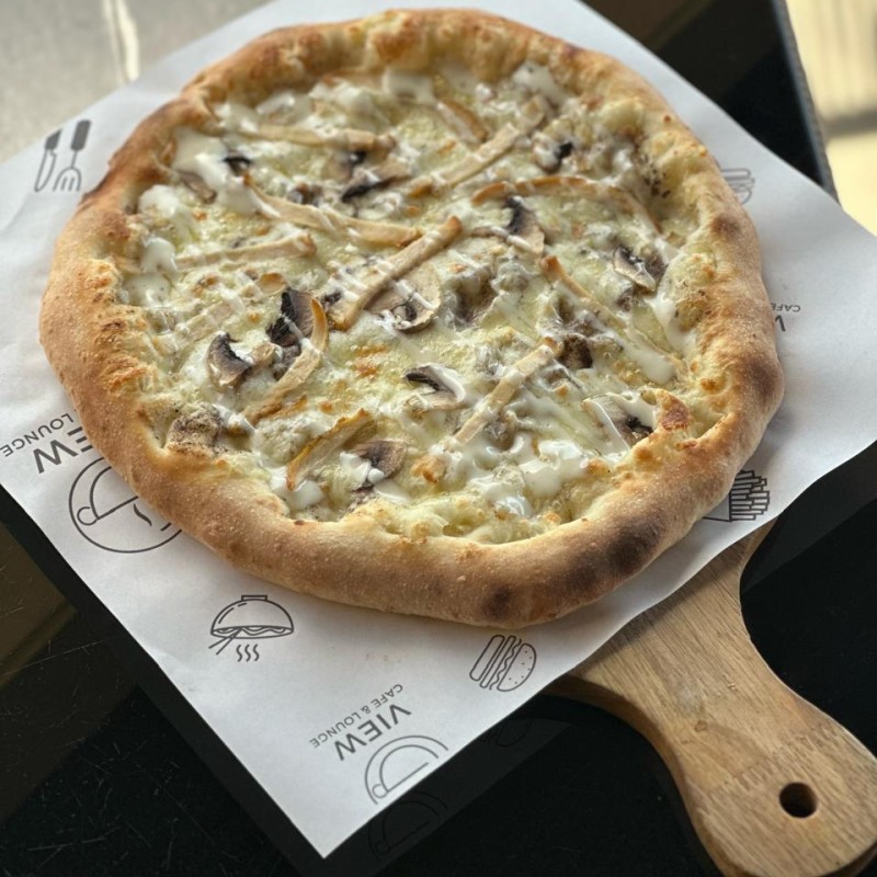 عجينة بيتزا طازجة مغطاة بصوص الرانش الكريمي بنكهة الترافل تُغطَّى بطبقة من الجبن الذائب وزيت الترفل+الماشروم