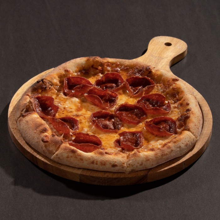 (350 سعرة حرارية)عجينة إيطالية مخبوزة ، تُغطى بصلصة الطماطم وجبن الموزاريلا الذائب، وتُزين بشرائح البيبروني المدخن
